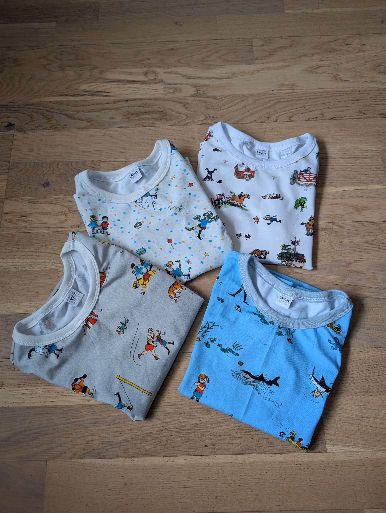 Kläderna är sydda efter barnens längd och kan upplevas som "stora i storleken" i jämförelse med övriga handeln.