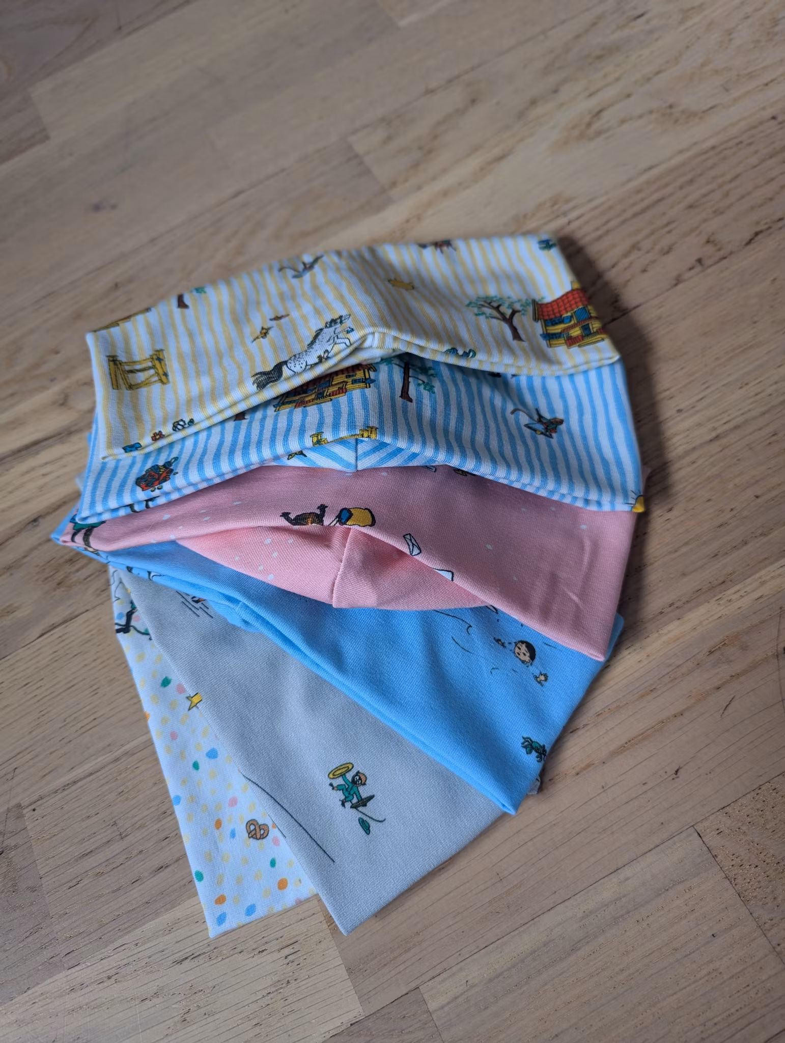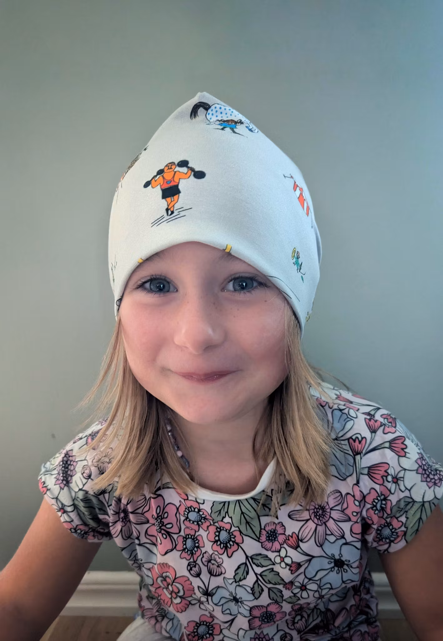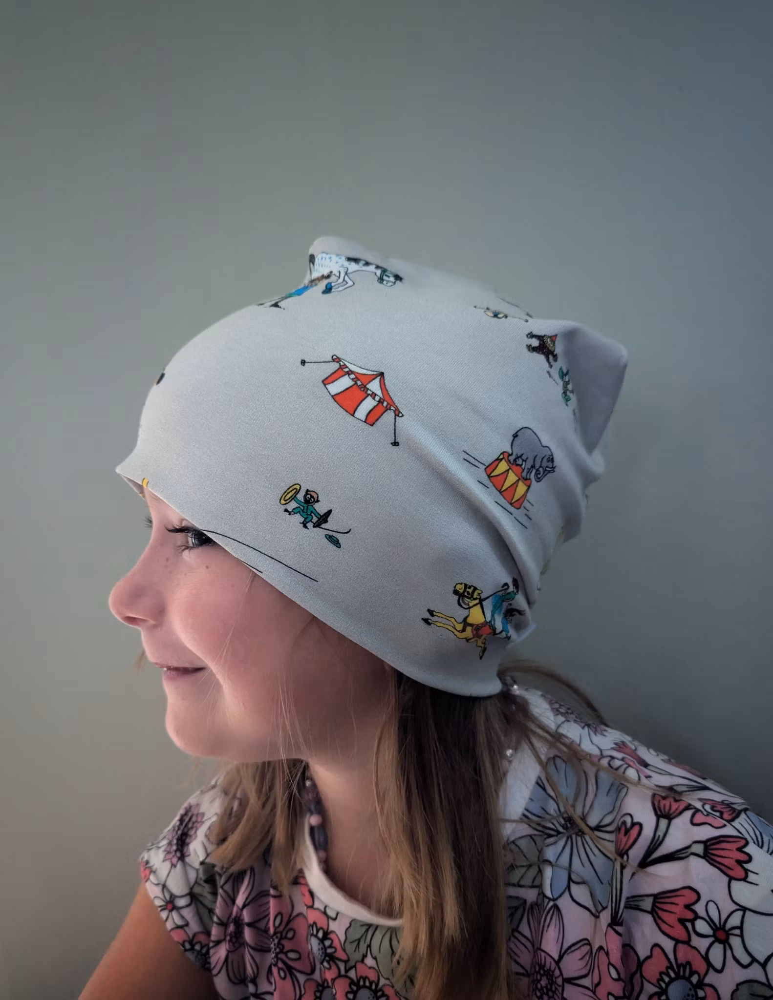 Ekologisk och sydd efter dina mått och önskemål. Du väljer storlek som anges i centimeter samt om du önskar fodrad med fleece eller i dubbel trikå. Till vår och höst räcker dubbel trikå gott och väl, men under vintern värmer den fleecefodrade mössan bäst.
