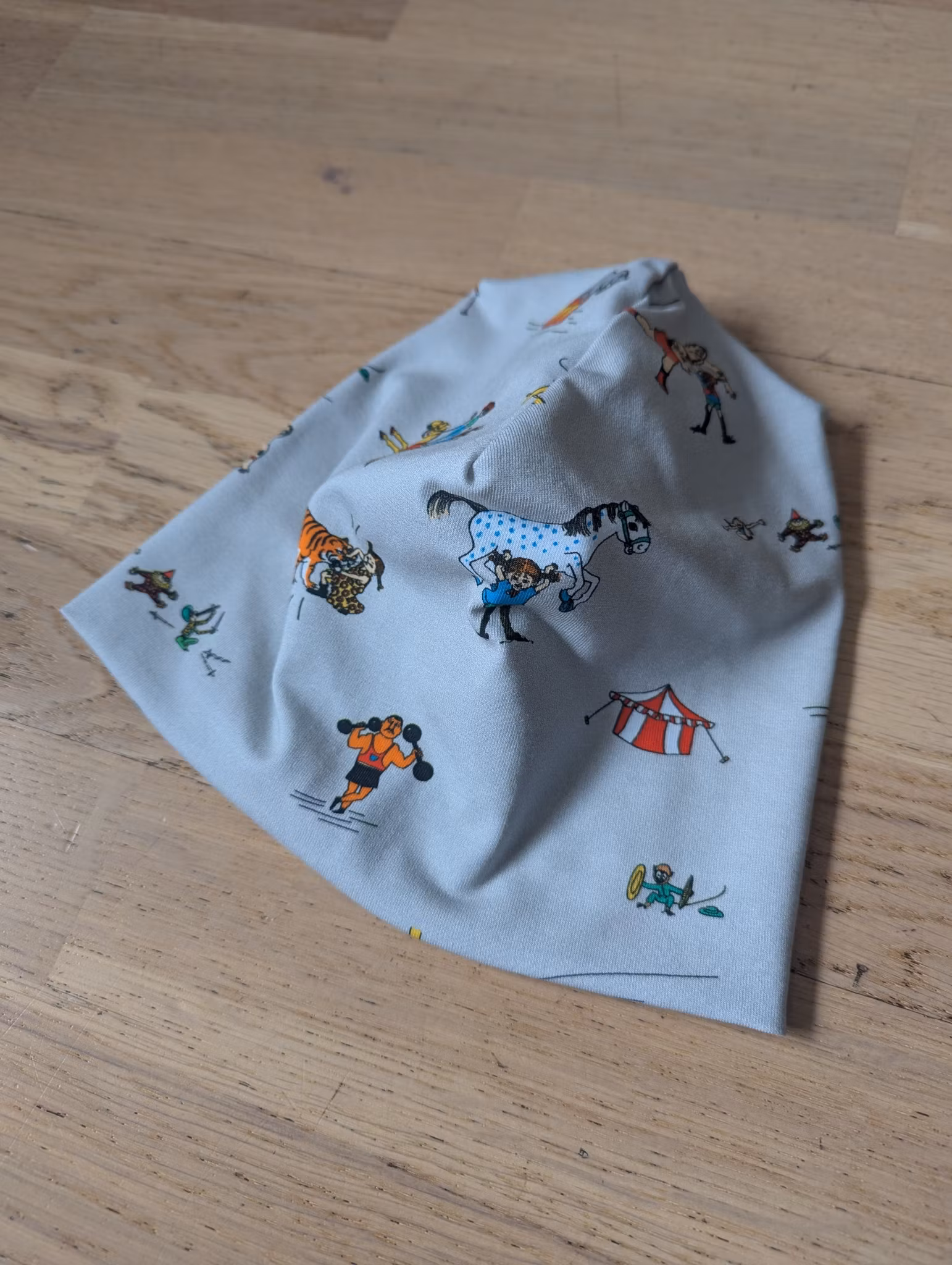 Pippi Långstrump på cirkus där bakgrundsfärgen är lite grå/beige.. Tyget är mjukt och stretchigt och består av 95% bomull och 5% lycra.